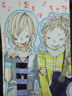 あと、似顔絵書いてくれる子もいるんですよー♪先週頼んどいたのをいただいたのでUPしときますね★3枚お願いしてたんですケド、これは僕とボーカルの子のイメージ画デス★もちろんお金は払ったどー!!!
