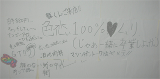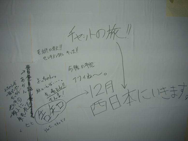 そして第二段壁落書きもいっぱいになってきたので・・・公開☆ なかなか濃い内容ですわwww 色恋100%ムリ!=色恋を最近まで勘違いしてましたwww GT!=ゴールデンタイム! 顔のない街の中で=2曲目ですねwww(何の??) 麦は穀物=ビールもそうだぜ! 酒池肉林=OPEN!なLIFEだな〜w ラップ娘=めちゃイケででてるみたい・・・ マンゴーアイス一口ちょうだい=気持ちわかるぜ! 吉牛380円=豚丼では駄目ですか・・・ などなど・・・