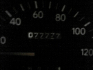 今日車を運転している時のことです。 ふと走行距離に目をやった瞬間… な、なんと!! 77776`!!! あと1`でオールセブンッ! とりあえず記念撮影と思って携帯を手にとりゆっくりと走りました… (50K走行の道路を20K走行でww) そしてついにきましたっ!! オール7(゜.゜) 車を路肩に止めとりあえず記念撮影。ご覧くださいm(__)m この興奮を皆様にもおすそ分けwww
